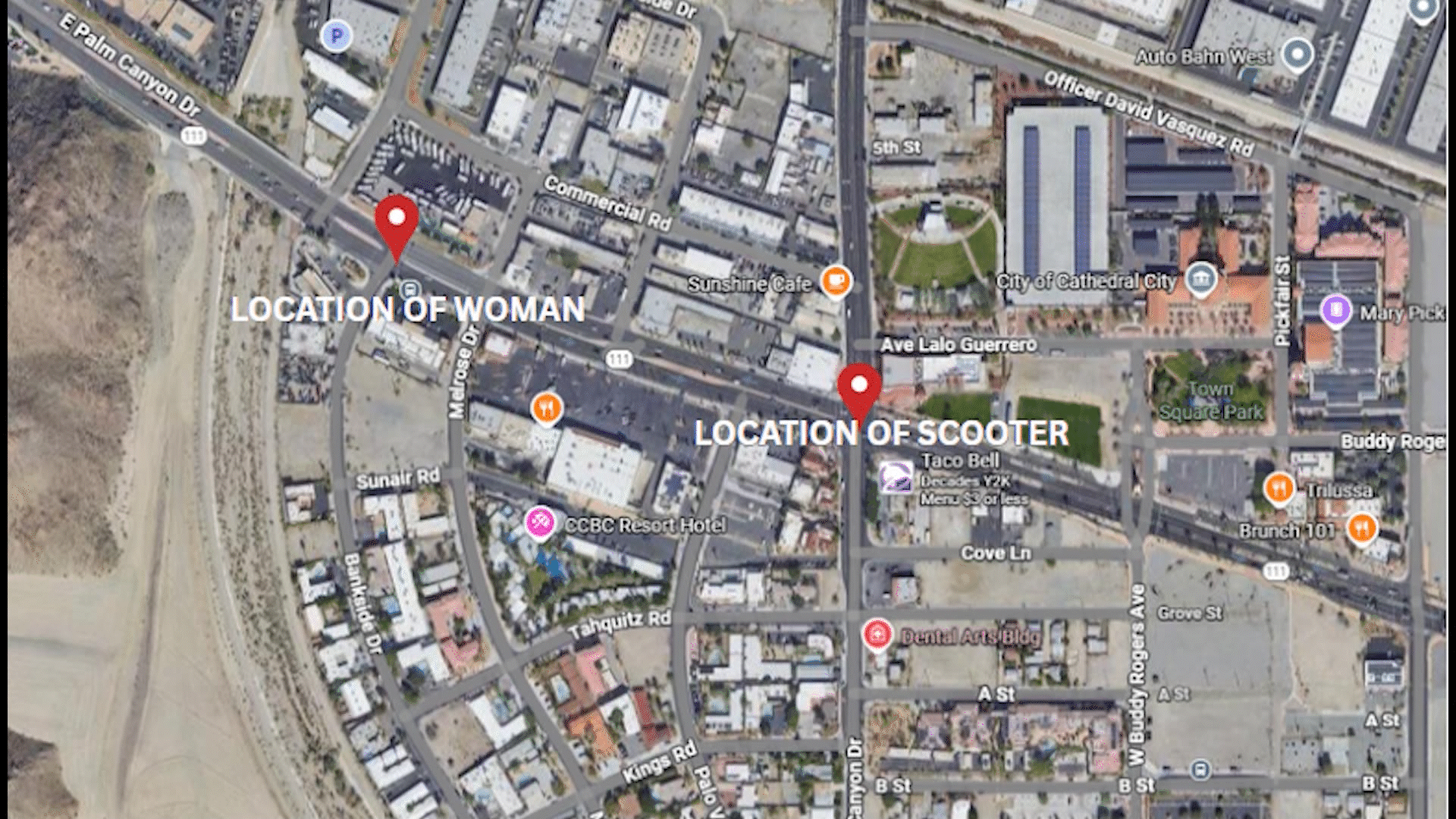 Al llegar, encontraron a una mujer y a un pequeño perro en la vía, al oeste de Bankside Drive. Su scooter fue hallada cerca de la intersección de East Palm Canyon y Cathedral Canyon Drive.