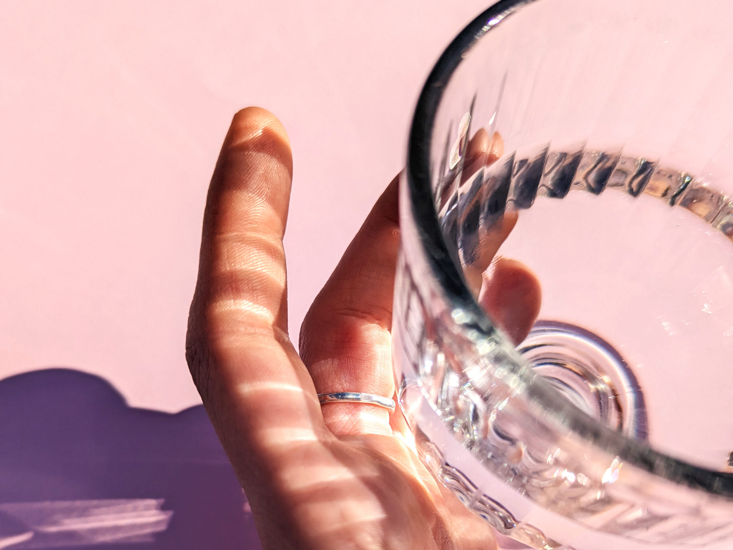 Hand holding a glass under the sun with reflections