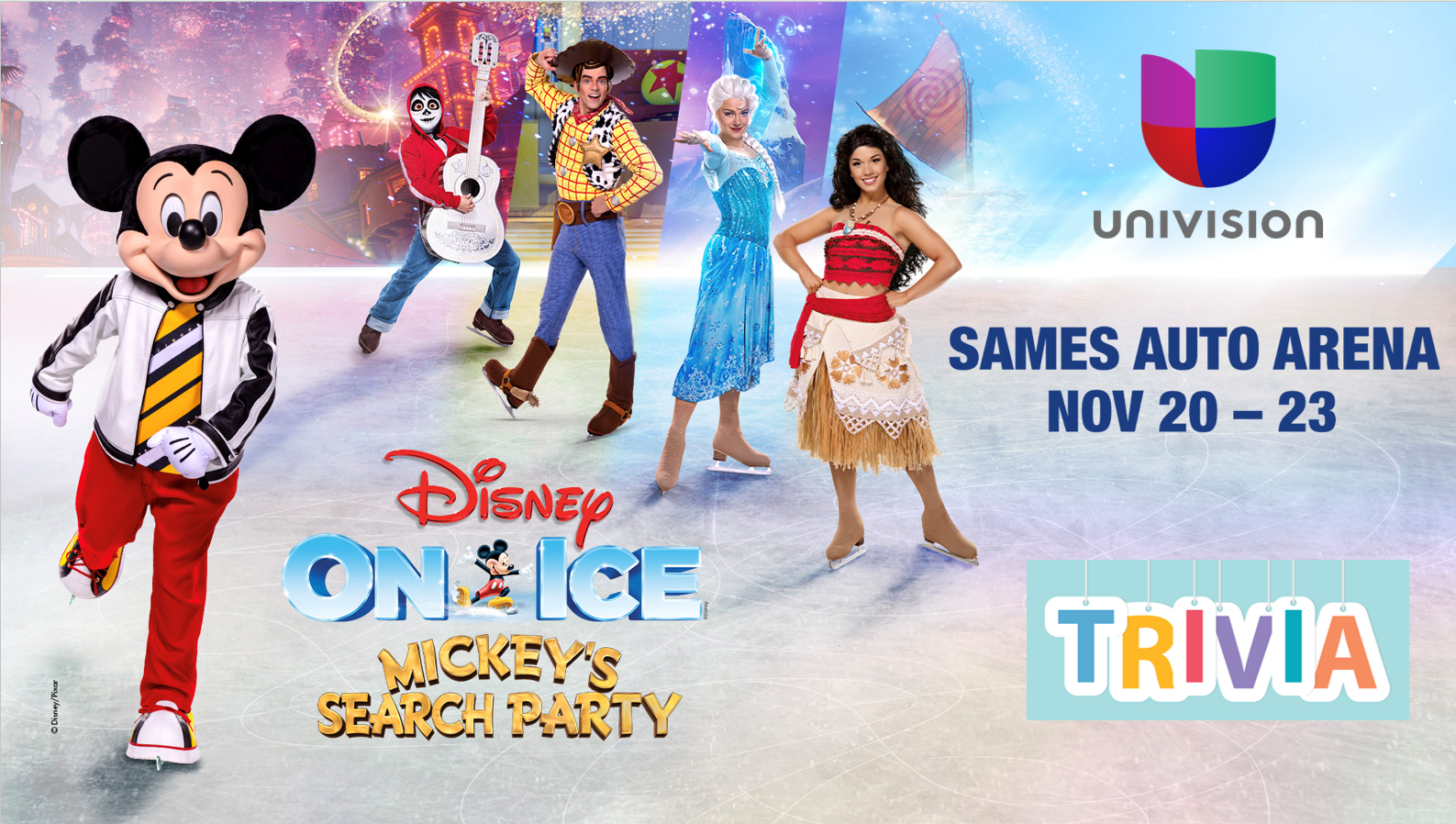 Disney On Ice llegará al Sames Auto Arena del 20 al 23 de noviembre, y Univision Laredo te invita a participar en una trivia sobre estos icónicos personajes. Tendrás la oportunidad de ganar un paquete familiar de cuatro boletos para disfrutar de este inolvidable espectáculo. Los ganadores se anunciarán en vivo a través de nuestras redes sociales durante un Facebook Live el lunes 17 de noviembre a las 3:00 p.m.
