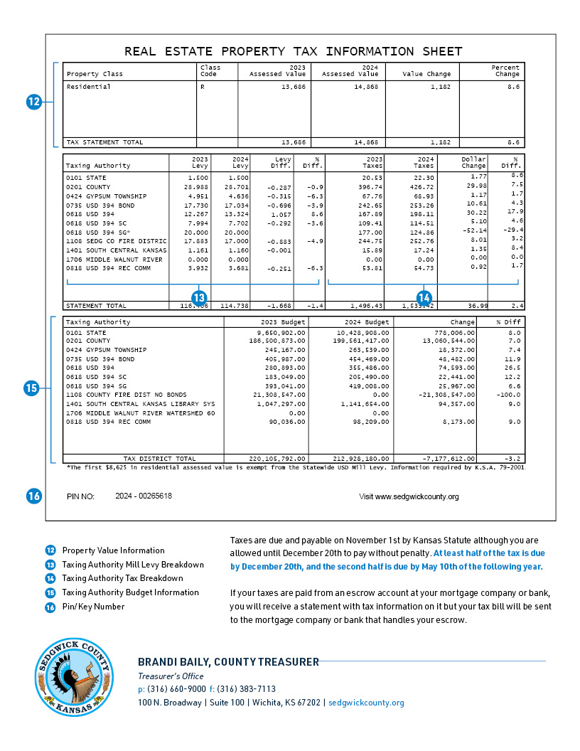 La tesorera del condado, Brandi Baily, recordó que en estas facturas se incluye información proveniente de más de 100 jurisdicciones, no solo del condado de Sedgwick. En la parte trasera del documento, los propietarios pueden ver un desglose exacto de cuánto aporta su pago a cada entidad, desde distritos escolares hasta departamentos de servicios públicos.